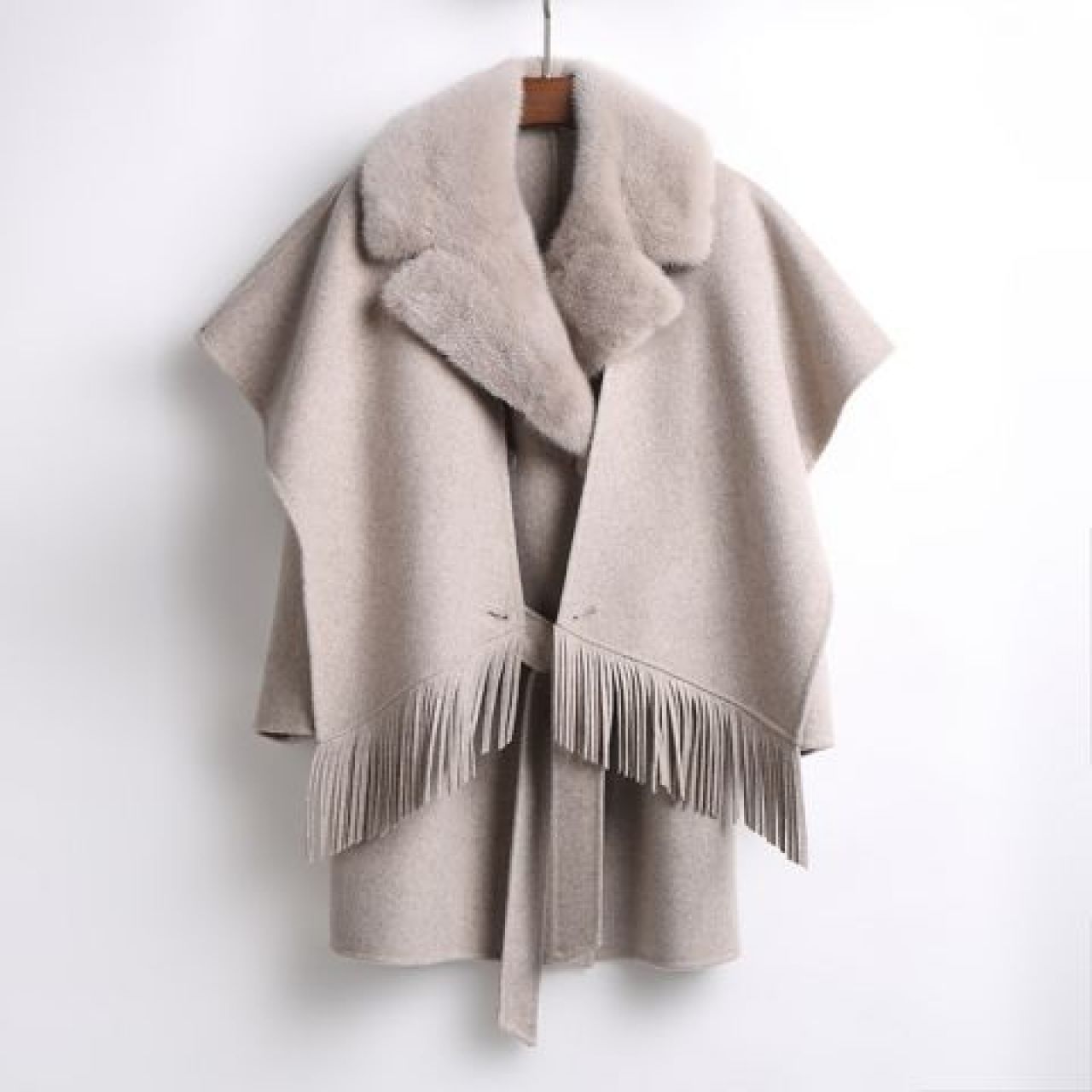 女士双面羊绒水貂皮草毛领轻奢流苏斗篷大衣外套(浅灰色)