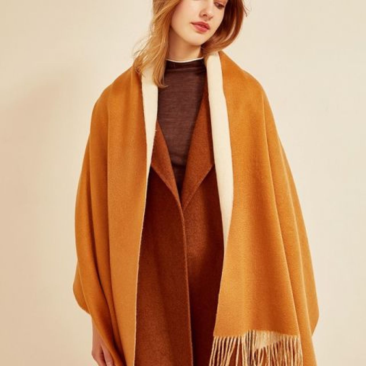 山羊绒水波纹双面披肩加厚款羊绒保暖披肩(驼白双面)